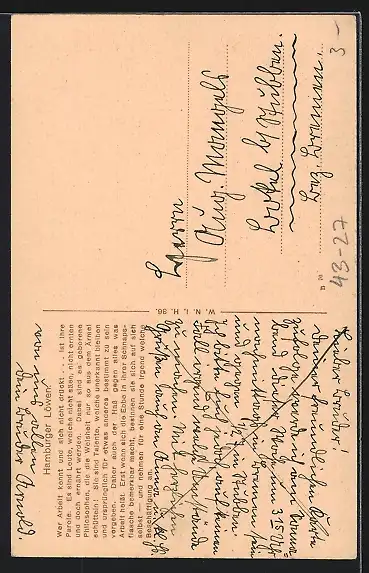 Personenbezogene Daten auf der Rückseite der Karte wurden durch blauen Textmarker unkenntlich gemacht. Die blauen Stellen sind auf die Vorderseite durchgeweicht und wirken sich negativ auf das Postkartenfoto aus