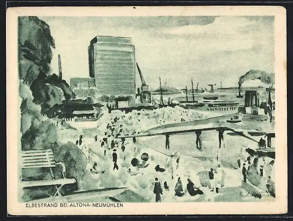Künstler-AK Hamburg-Neumühlen, Elbestrand mit Besuchern