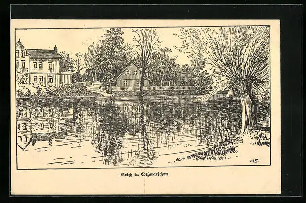 Künstler-AK Hamburg-Othmarschen, Ortsansicht mit Teich