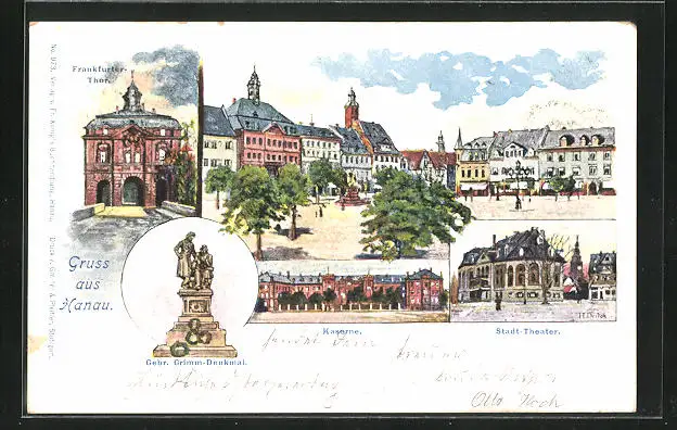 Künstler-AK Hanau, Kaserne, Stadt-Theater, Frankfurter Tor