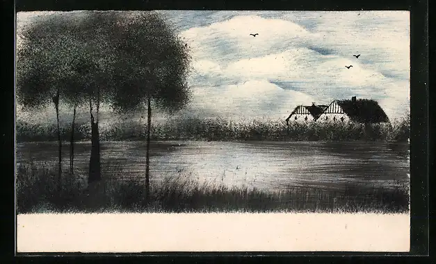 Künstler-AK Handgemalt: Bauernhäuser an einem Seeufer