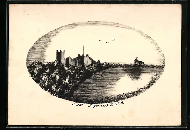 Künstler-AK Handgemalt: Burg und Kirche am Ammersee