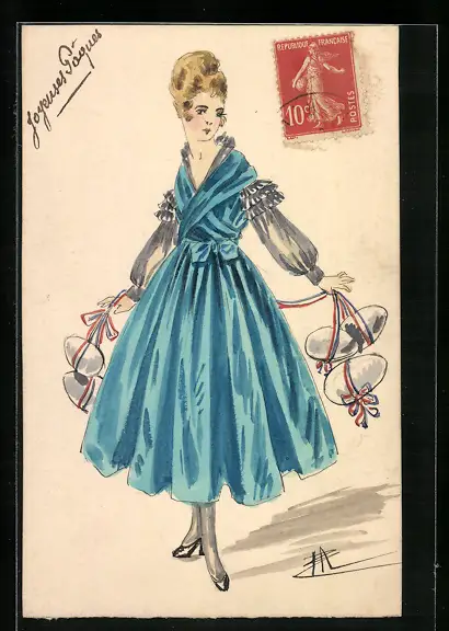 Künstler-AK Handgemalt: Dame in blauem Kleid und Rüschenärmeln