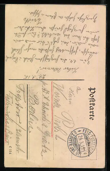 Personenbezogene Daten auf der Rückseite der Karte wurden durch blauen Textmarker unkenntlich gemacht. Die blauen Stellen sind auf die Vorderseite durchgeweicht und wirken sich negativ auf das Postkartenfoto aus