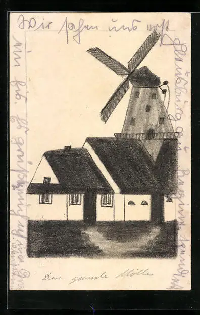 Künstler-AK Handgemalt: Düppel, Häuser und Windmühle