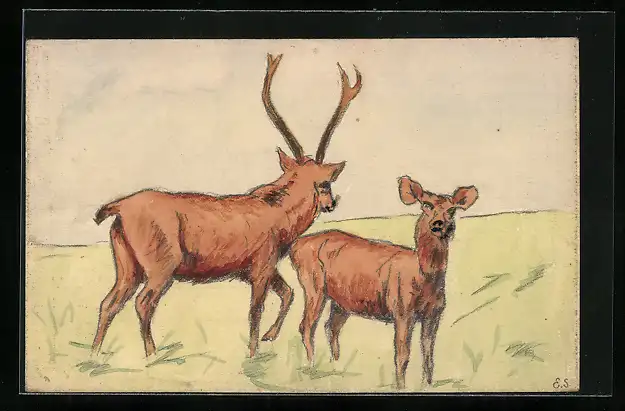 Künstler-AK Handgemalt: Ein Hirsch und eine Hirschkuh