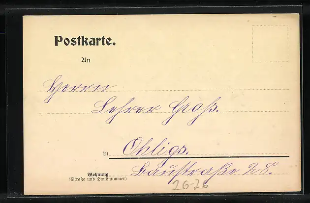 Personenbezogene Daten auf der Rückseite der Karte wurden durch blauen Textmarker unkenntlich gemacht. Die blauen Stellen sind auf die Vorderseite durchgeweicht und wirken sich negativ auf das Postkartenfoto aus