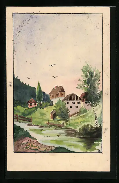 Künstler-AK Handgemalt: Flusspartie mit Häusern