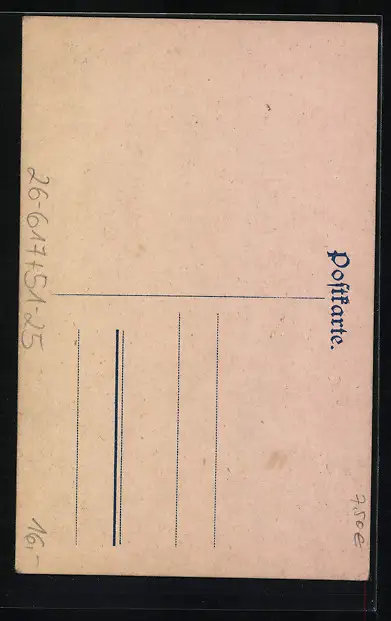 Personenbezogene Daten auf der Rückseite der Karte wurden durch blauen Textmarker unkenntlich gemacht. Die blauen Stellen sind auf die Vorderseite durchgeweicht und wirken sich negativ auf das Postkartenfoto aus