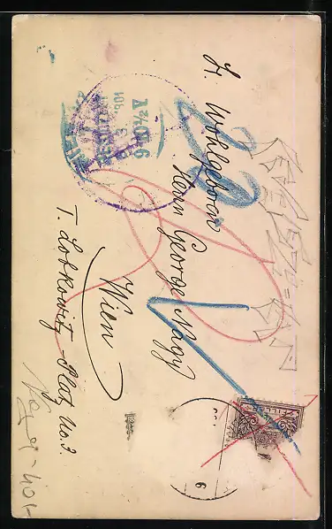 Personenbezogene Daten auf der Rückseite der Karte wurden durch blauen Textmarker unkenntlich gemacht. Die blauen Stellen sind auf die Vorderseite durchgeweicht und wirken sich negativ auf das Postkartenfoto aus
