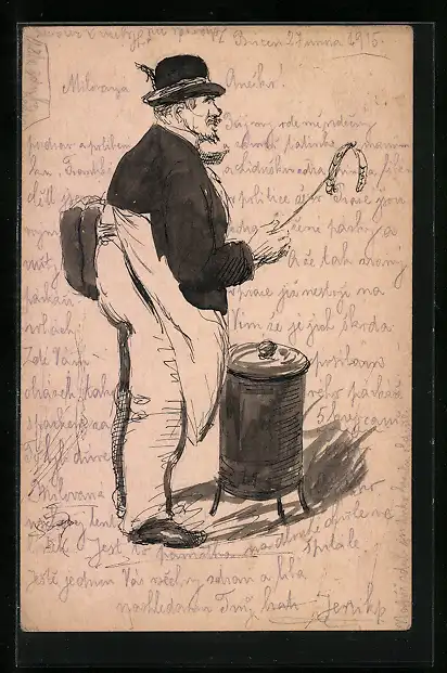 Künstler-AK Handgemalt: Händler mit gekochten Würstchen an einem Topf