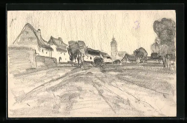 Künstler-AK Handgemalt: Idyllisches Dorf mit Kirche
