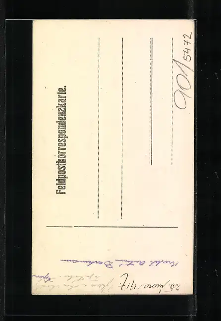 Personenbezogene Daten auf der Rückseite der Karte wurden durch blauen Textmarker unkenntlich gemacht. Die blauen Stellen sind auf die Vorderseite durchgeweicht und wirken sich negativ auf das Postkartenfoto aus