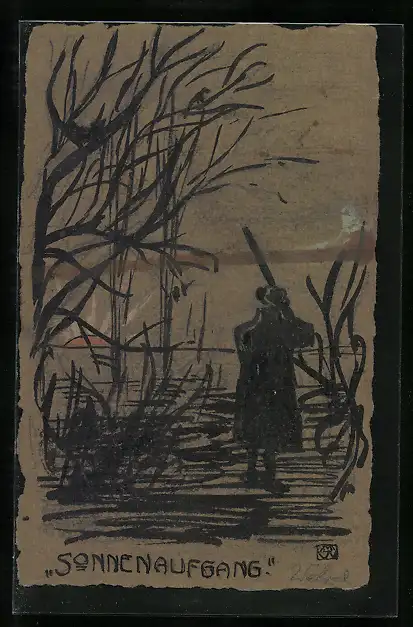 Künstler-AK Handgemalt: Jäger bei Sonnenaufgang