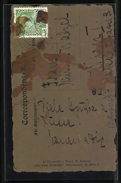 Personenbezogene Daten auf der Rückseite der Karte wurden durch blauen Textmarker unkenntlich gemacht. Die blauen Stellen sind auf die Vorderseite durchgeweicht und wirken sich negativ auf das Postkartenfoto aus