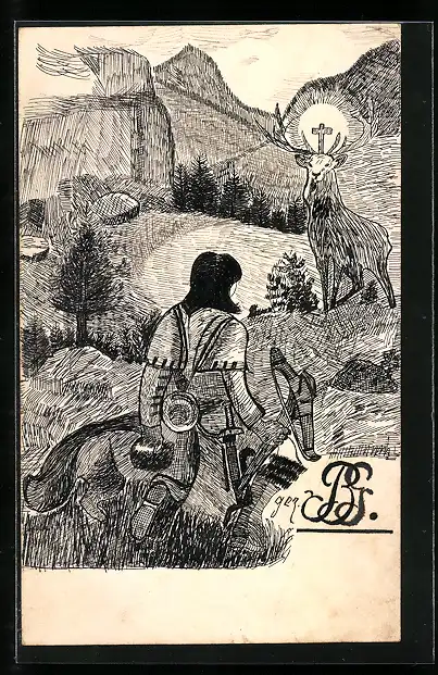 Künstler-AK Handgemalt: Jäger trifft im Gebirge auf Hirsch