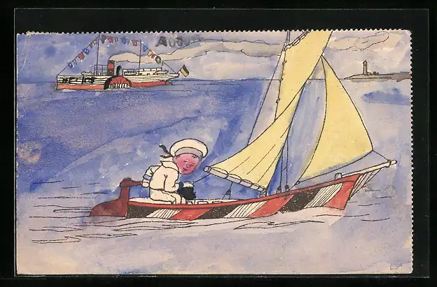 Künstler-AK Handgemalt: Kleiner Matrose im Segelboot