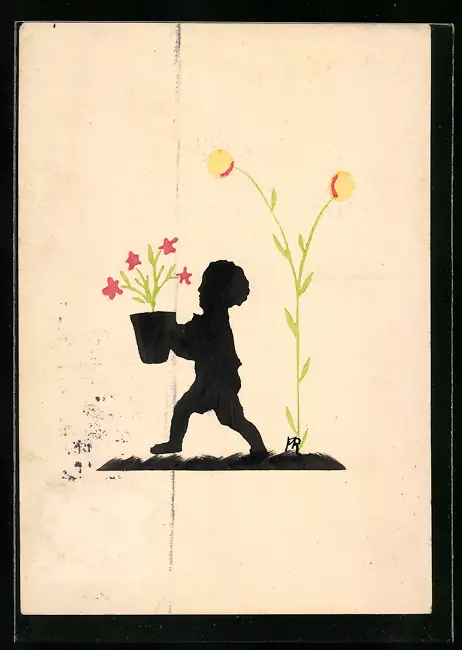 Künstler-AK Handgemalt: Knabe mit Blumentopf