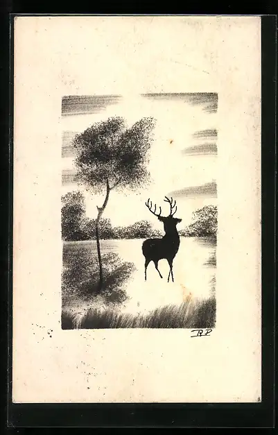 Künstler-AK Handgemalt: Landschaft mit Hirsch