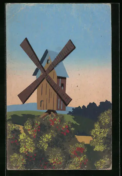 Künstler-AK Handgemalt: Landschaft mit Windmühle, Schablonenmalerei