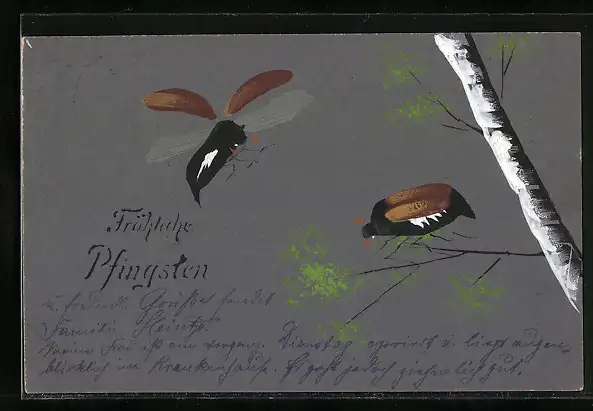 Künstler-AK Handgemalt: Maikäfer mit Pfingstgruss, Schablonenmalerei