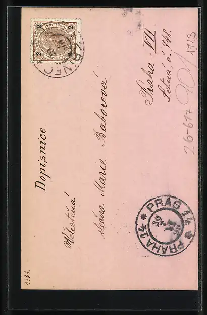 Personenbezogene Daten auf der Rückseite der Karte wurden durch blauen Textmarker unkenntlich gemacht. Die blauen Stellen sind auf die Vorderseite durchgeweicht und wirken sich negativ auf das Postkartenfoto aus