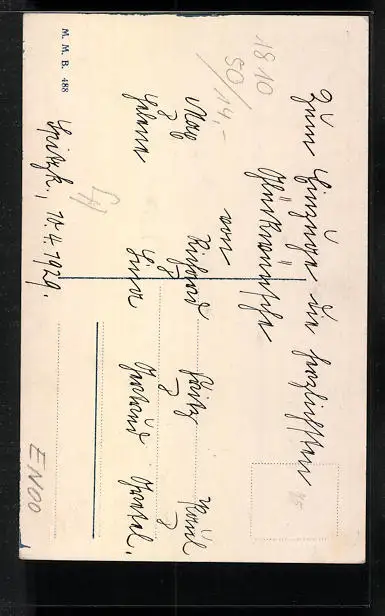 Personenbezogene Daten auf der Rückseite der Karte wurden durch blauen Textmarker unkenntlich gemacht. Die blauen Stellen sind auf die Vorderseite durchgeweicht und wirken sich negativ auf das Postkartenfoto aus