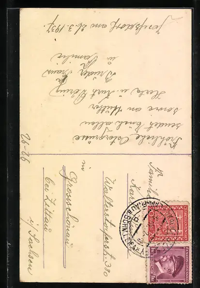 Personenbezogene Daten auf der Rückseite der Karte wurden durch blauen Textmarker unkenntlich gemacht. Die blauen Stellen sind auf die Vorderseite durchgeweicht und wirken sich negativ auf das Postkartenfoto aus