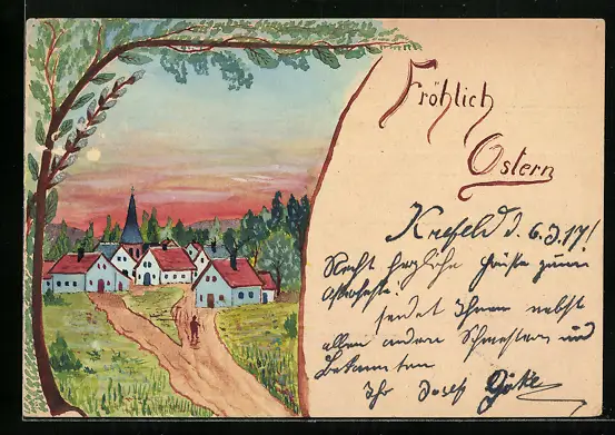 Künstler-AK Handgemalt: Ortspartie mit Kirche, Ostergruss