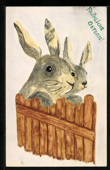 Künstler-AK Handgemalt: Osterhasen schauen über einen Zaun