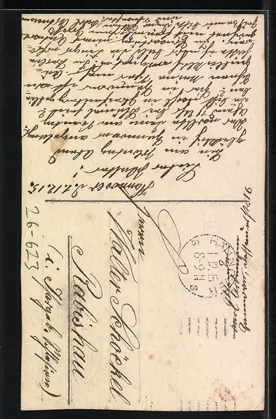Personenbezogene Daten auf der Rückseite der Karte wurden durch blauen Textmarker unkenntlich gemacht. Die blauen Stellen sind auf die Vorderseite durchgeweicht und wirken sich negativ auf das Postkartenfoto aus