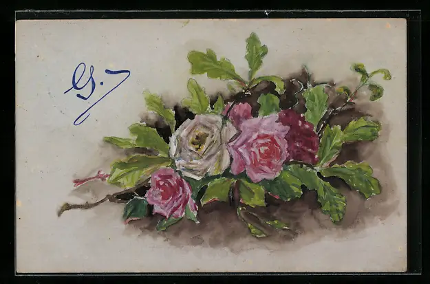 Künstler-AK Handgemalt: Rote Rosen und Eichenlaub
