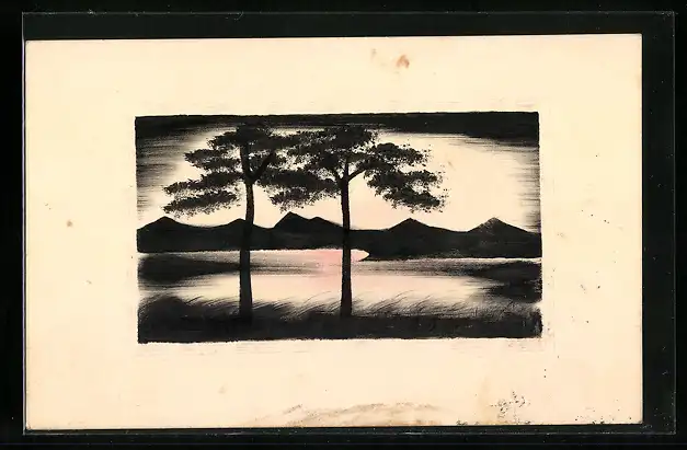 Künstler-AK Handgemalt: Schablonenmalerei, Bäume in der Dämmerung