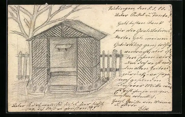 Künstler-AK Handgemalt: Schutzhütte mit Lattenzaun