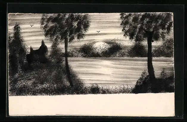 Künstler-AK Handgemalt: See bei Dämmerung, Schablonenmalerei