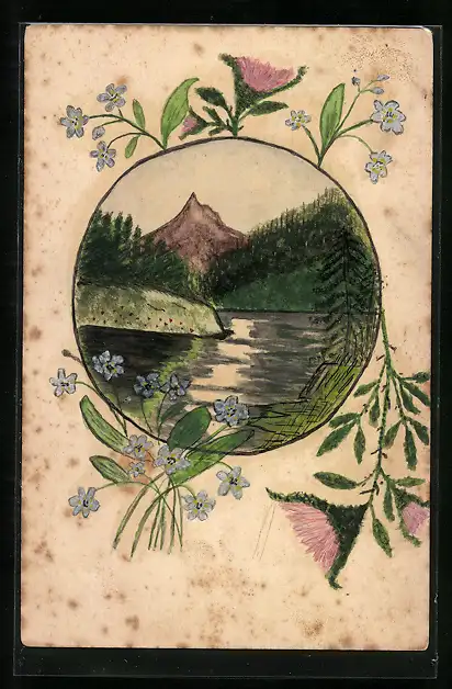 Künstler-AK Handgemalt: Seepartie mit Berggipfel, Blumen