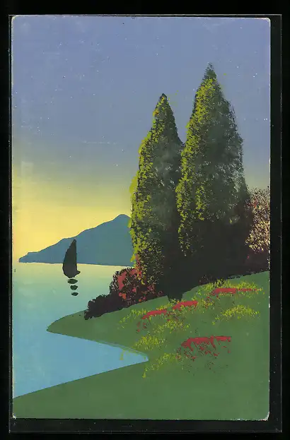 Künstler-AK Handgemalt: Seeufer mit Blumenwiese
