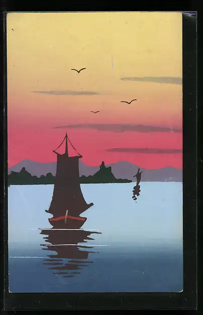 Künstler-AK Handgemalt: Segelboot unter gelbrotem Himmel