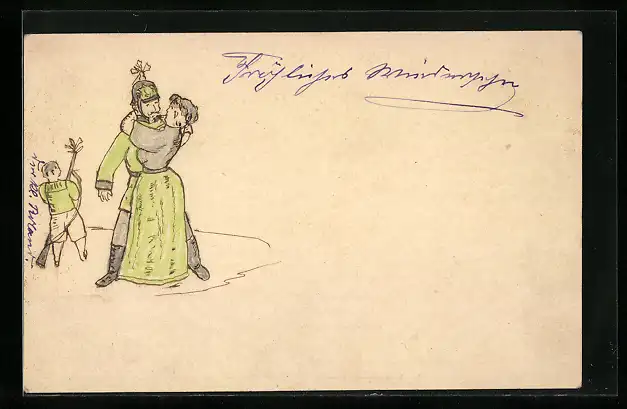 Künstler-AK Handgemalt: Soldat wird von Frau umarmt