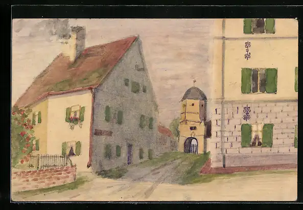 Künstler-AK Handgemalt: Strasse mit Häusern und Torturm
