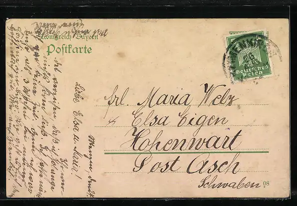 Personenbezogene Daten auf der Rückseite der Karte wurden durch blauen Textmarker unkenntlich gemacht. Die blauen Stellen sind auf die Vorderseite durchgeweicht und wirken sich negativ auf das Postkartenfoto aus