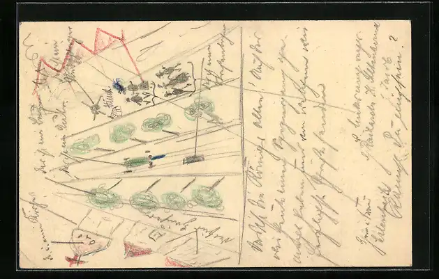 Personenbezogene Daten auf der Rückseite der Karte wurden durch blauen Textmarker unkenntlich gemacht. Die blauen Stellen sind auf die Vorderseite durchgeweicht und wirken sich negativ auf das Postkartenfoto aus