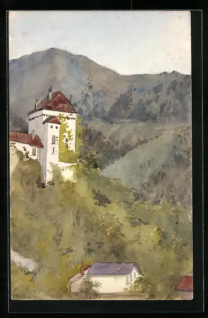 Künstler-AK Handgemalt: Turmgebäude im Gebirge