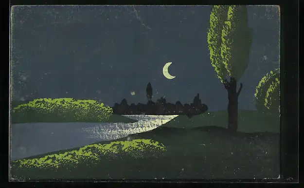 Künstler-AK Handgemalt: Uferpartie im Mondschein, Schablonenmalerei