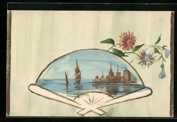 Künstler-AK Handgemalt: Uferpartie mit Segelboot im Fächer