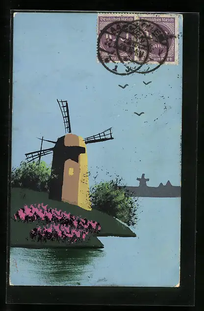 Künstler-AK Handgemalt: Windmühle am Wasser