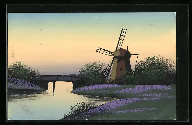 Künstler-AK Handgemalt: Windmühle im Abendlicht, Schablonenmalerei