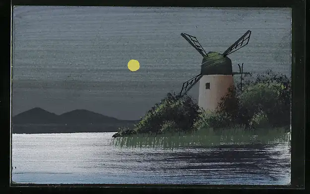 Künstler-AK Handgemalt: Windmühle im Mondschein, Schablonenmalerei