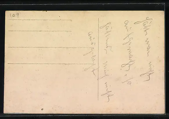 Personenbezogene Daten auf der Rückseite der Karte wurden durch blauen Textmarker unkenntlich gemacht. Die blauen Stellen sind auf die Vorderseite durchgeweicht und wirken sich negativ auf das Postkartenfoto aus