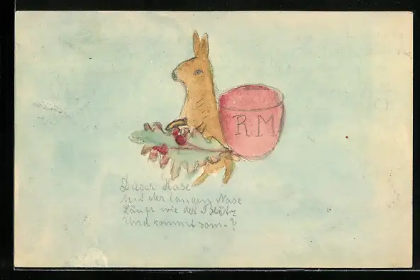 Künstler-AK Handgemalt: niedlicher Hase mit Eichenblatt und Korb auf dem Rücken